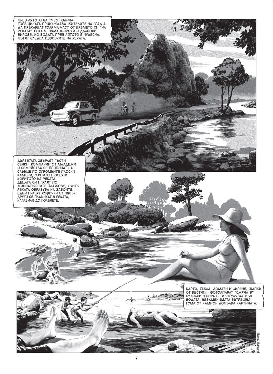 Петър: При нас решенията се взимат на десето число всеки месец. Дружното решение на това десето число беше, че всички искаме да работим по сценарий на Сотир. Той обаче се заинати, че ще му дойде в повече да пише шест сценария. Тогава Пенко, понеже е най-малък и най-умен, предложи шестимата да рисуваме по един сценарий, но всеки – както си иска. Беше лято и мен ме мързеше да оцветявам, затова казах, че ми се рисува нещо черно-бяло и смразяващо. Гената също каза, че го мързи, и си поиска човек, заровен до шията в пустиня. Димо пък беше решил цяло лято да лови риба и си поръча нещо по-късичко. Румен предложи главният герой да прилича на Шарл Азнавур. Всичко останало е дело на Соти.