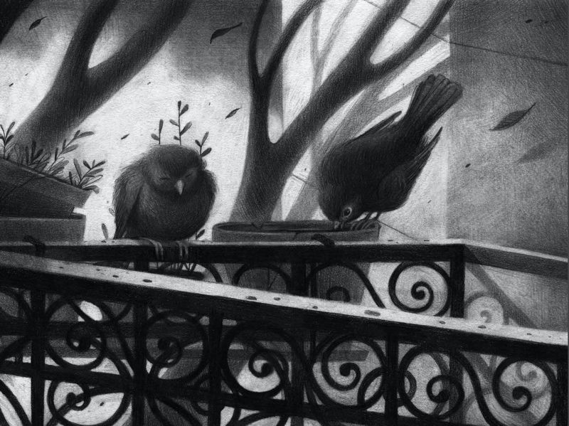 „Балконът“ съществува в друг ритъм. Моливът на Калина Мухова не маркира детайлите като този на Селзник, а се задълбочава в тях. Не е черновата на режисьора. В книгата сме в света на малко момиче: самото то вероятно обича моливите си и сигурно все още не умее да се изразява добре с думи. Когато рисува това момиче, художничката някак естествено преминава в по-детски стил; в лицата на възрастните се вижда друго умение. Докосващо е, защото виждаш, че Мухова съчувства на героите си, мила е с тях, внимава да влезе в света им. Това ти помага да поискаш да се приближиш, което ми се струва важно за книга без текст. Нищо не те държи на ръка разстояние, дори първоначално да си отгърнал с недоверие. Усеща се, сякаш рисунките ти казват: „Хайде доближи се, виж какво има тук, ела да разгледаш и там…“