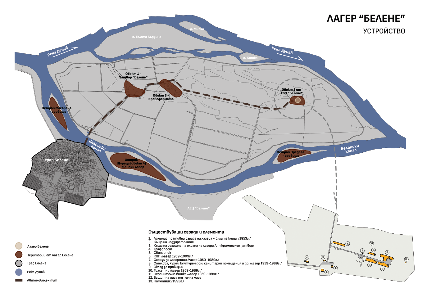 Лагерът се намира в област Плевен, на територията на остров Персин (Белене) в река Дунав, северно от града. Беленският край има дълга история – от Античността до наши дни. Още в римско време е изграден каналът, който и до днес отделя града от острова. Но доминиращият исторически наратив за района е свързан със социалистическия период и репресивната политика на режима. На 20 декември 1944 г. е приета Наредбата-закон за трудововъзпитателните общежития за политически опасните лица. На 27 април 1949 г. със секретно постановление е открито Трудово-възпитателно общежитие (ТВО) „Белене“, известно още като Обект 2. Достъпът до него е през понтонен мост и по бетонния път през сърцевината на острова до най-източната му част.