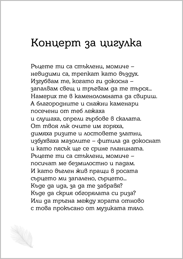 Струва ми се, че първата светлина от този негов неистов път идва от запалената в ръцете му свещ, която още в онова ранно време, когато се ражда и „Концерт за цигулка“, го отвежда именно в каменоломната – при прозирно трепкащите ръце на момичето, което свири. И той става част от онези заслушани в музиката благородни и снажни каменари – с горящи очи и димяща риза, опрял гръб в скалата, на един дъх разстояние от фитила, под който в тревата вече тихо пращи като въглен сърцето му…