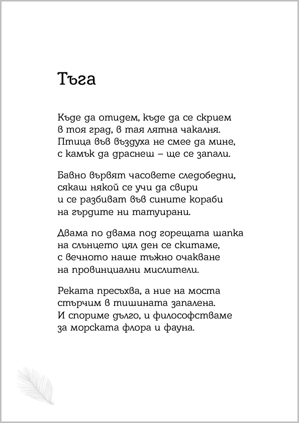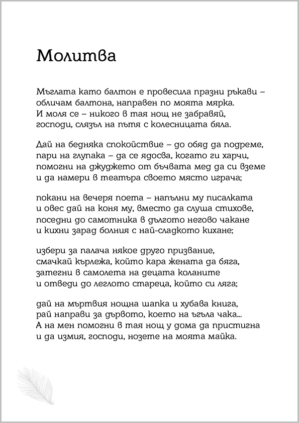 Това е поезия с бликаща жизненост, примесена с меланхолия. Има нещо библейски мъдро у него, нещо, което говори от началата на света, а в същото време притежава фини рецептори за простотата, от която този свят е съставен, и за естеството, което ни обгражда и от което сме част. В онова гадно блатно време стихотворенията му бяха невъзможен остров, те казваха, без да крещят, тихо, както той говори, казваха много за тогавашния ни живот, ограден с мрежи, за хората вътре „като добичета покорни“.