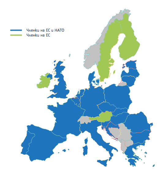 Освен това, както е видно от фигурата по-долу (където скоро и Великобритания няма да е синя), в ЕС основното ядро са страни от НАТО, което означава, че Европейската отбрана може да се гради успешно само с отчитане на фундамента, поставен от НАТО. За страните от Б9 пък има пълно припокриване – и 9-те страни са членки едновременно на ЕС и НАТО, а в миналото са били част от Варшавския договор и Съвета за икономическа взаимопомощ.