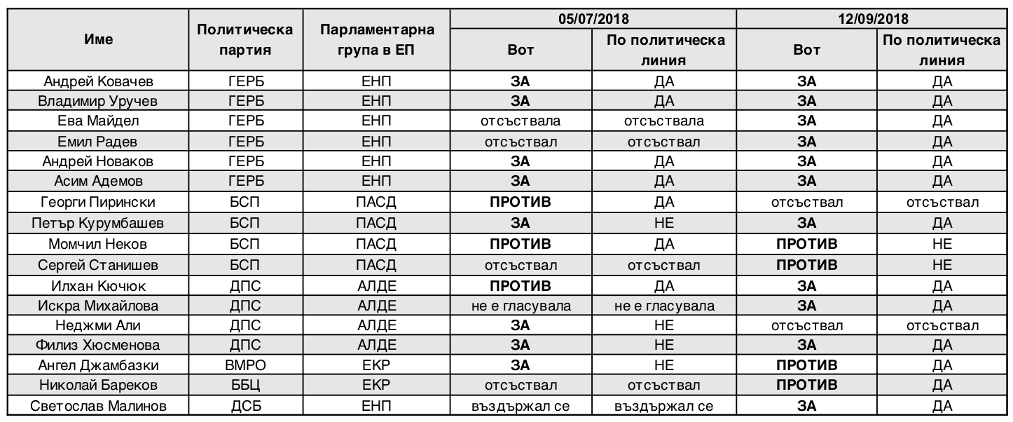 На гласуването на 12 септември обаче подкрепящите директивата са значително повече. Отрицателните гласове от българска страна идват от различни хора – Станишев, Бареков, Джамбазки, но единствено Момчил Неков показва някаква последователност. Той е и единственият към днешна дата български евродепутат, който заедно с още 107 свои колеги от ЕП декларира в платформата Pledge2019.eu, че няма да подкрепи предложението в предстоящия решаващ вот.