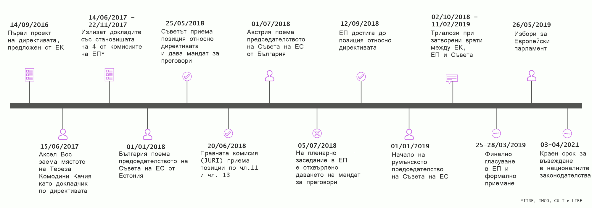 Следната инфографика показва нагледно какъв път измина досието за директивата за авторското право в цифровия единен пазар 2016/0280 (COD) от 2016 г. до днес. Важните събития и ключовите решения – гласувания в комисии, в пленарната зала, в Комитета на постоянните представители на държавите членки в ЕС (COREPER), публикувани изследвания и отворени писма и т.н. – са много повече. Ние ще се спрем само на някои от тях, с по-специален фокус върху българската позиция и това доколко българските евродепутати и държавници са изразители на нагласите на гражданското общество у нас и безкомпромисно защитават правата на европейските граждани като цяло и на българските в частност.