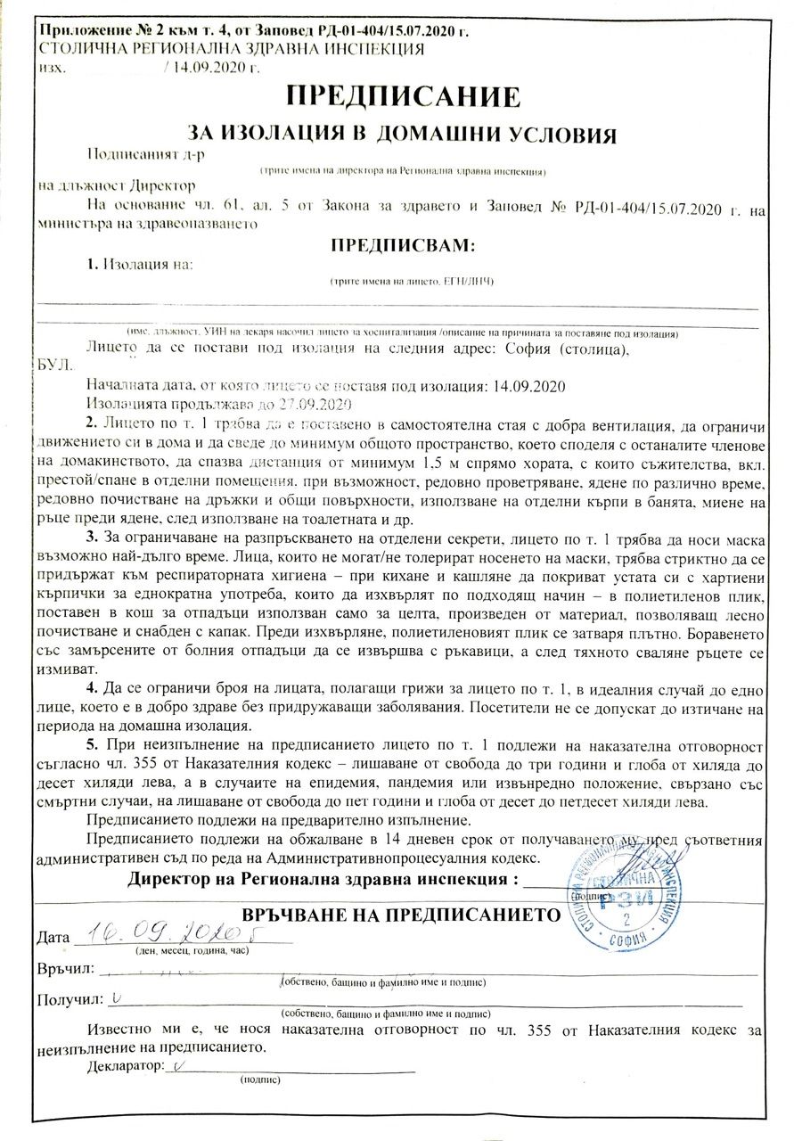 Карантината, обявена в заповедта, е с продължителност 14 дни. В документа е вписано 27 септември като крайна дата.