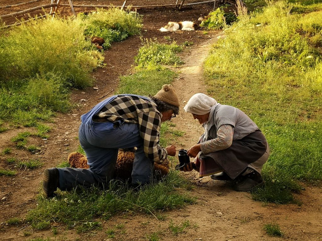 Денят тук се движи по разписание. Първо Емин издоява овцете и няколкото козички, които Мехмед вкарва една по една в плевнята. Това отнема около час. На Емин от доенето преди му се схващала ръката, но свикнал. Доенето не беше време за приказки – изтикани в ръцете му, между коленете му, животните внасяха суровата си енергия. Докато ги гледах, започнах да забелязвам разликите в израженията и породите.