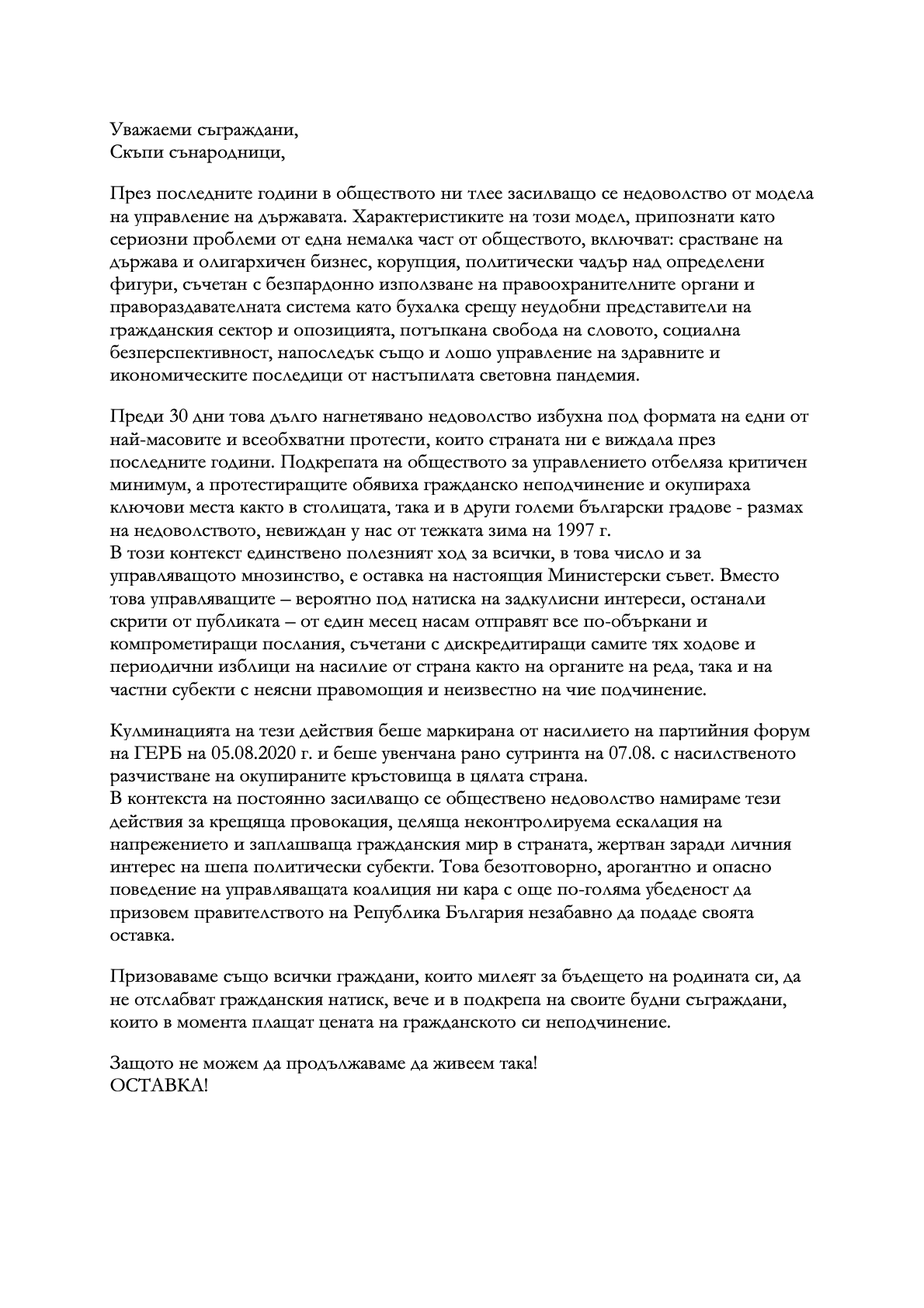 Това е развитие на нещата, което ми се искаше да беше станало реалност още след оставката на Пламен Орешарски през 2014 г. За съжаление, протестната енергия се уталожи, част от недоволните припознаха в Реформаторския блок своето представителство и започнаха да чакат неговите депутати и министри да убедят Бойко Борисов в належащата необходимост от реформи. Заради тази наивност изгубихме време, но по-добре нещата да се случат късно, отколкото никога. Процесът трябва да се катализира, докато автентичното гражданско представителство с нагласа за дълбоки реформи не получи решаваща подкрепа на избори. Дотогава продължавам да твърдя, че всяко управление у нас е заченато в грях и протестите срещу него по дефиниция и по подразбиране са правилни и заслужаващи подкрепа, независимо от тактическите и стратегическите подробности (защо еди-кои си протестират рамо до рамо с вас, какво ще стане после и прочее).