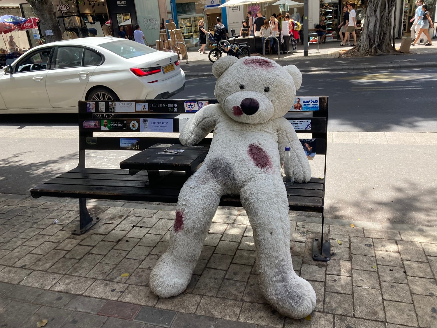 Върху пейките на улица „Дизенгоф“ в Тел Авив са поставени големи бели плюшени мечета с тъмночервени петна по козината, напомнящи на кръв. На облегалките са залепени снимки на отвлечените в Газа заложници. Бяха минали 222 дни от 7 октомври 2023 г.