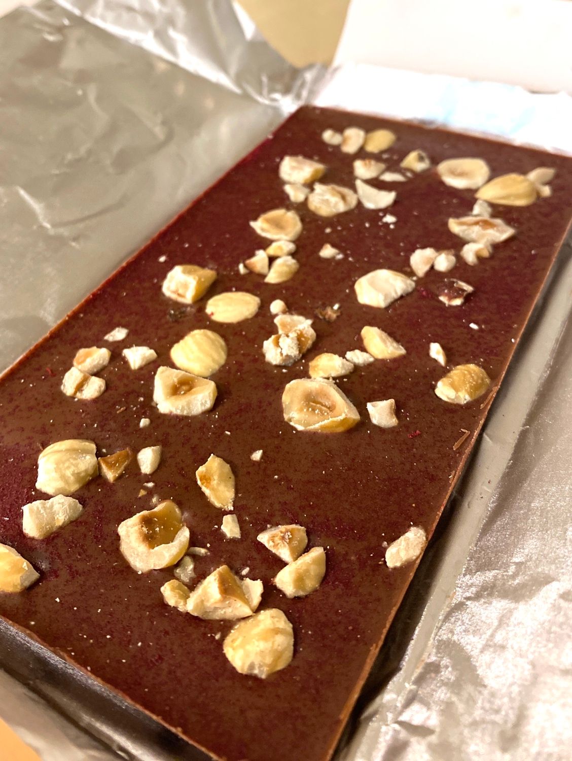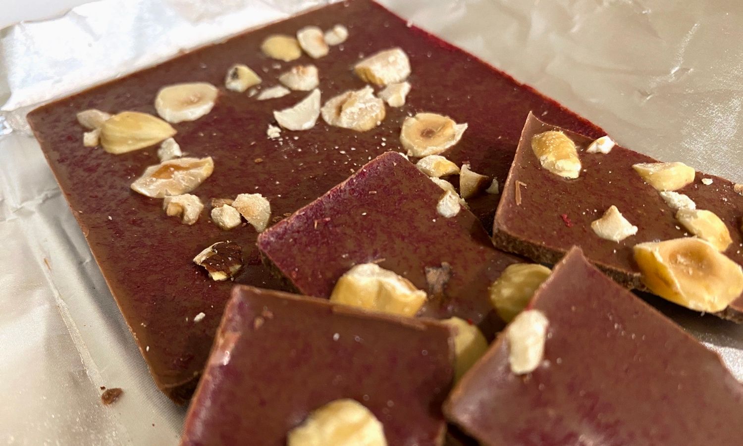 Млечен шоколад с лешници и поръска от сушени малини