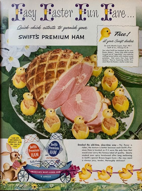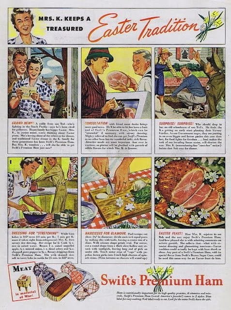 Вляво: Характерна за средата на миналия век реклама на великденска шунка, направена като комикс. Източник: Pinterest. В средата: Реклама на великденска шунка с рецепта от 40-те години на миналия век. Източник: eBay. Вдясно: Реклама на пушена великденска шунка в две разновидности