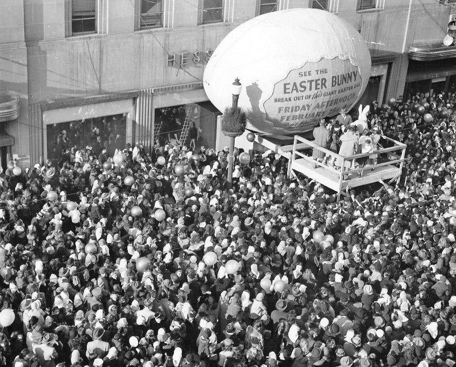 Вляво: Пристигането на великденския заек пред магазина „Хес“, 1968 г. Източник: Wikimedia Commons. Вдясно: Великденският заек с две жени от Вирджиния, 1960 г. Източник: Wikimedia Commons