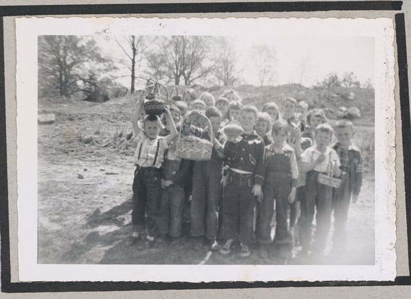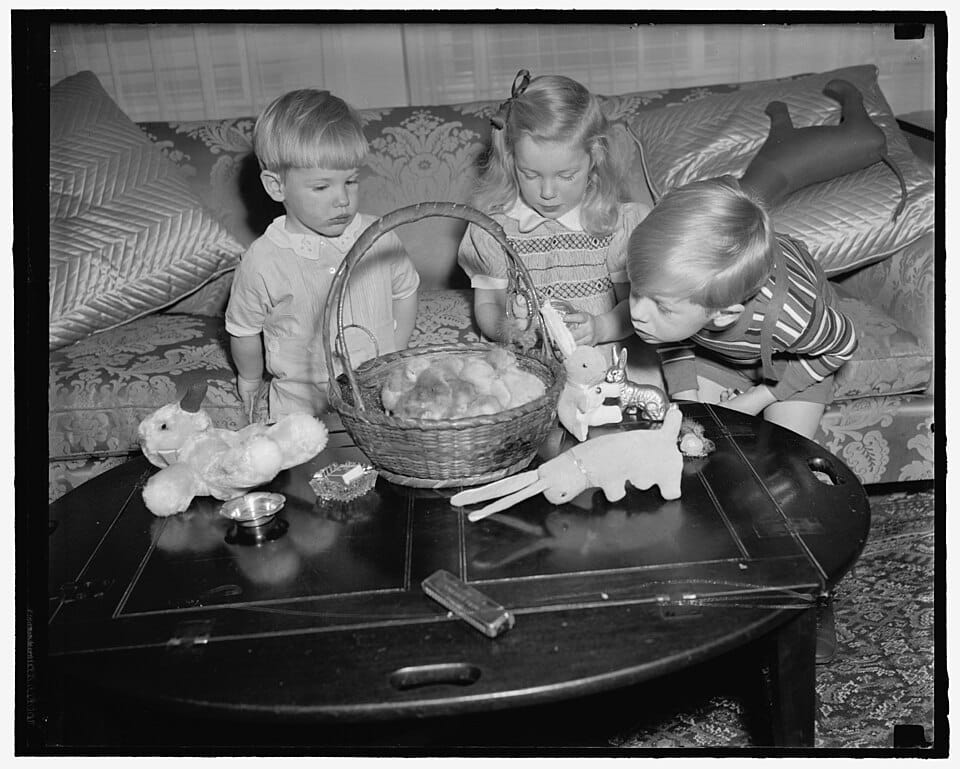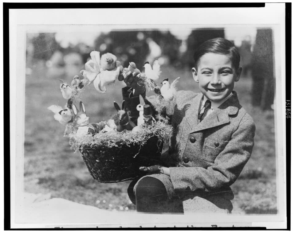 Вляво: Група деца с великденски кошници и голямо великденско яйце, Кларксвил, Джорджия, 1950 г. Източник: Wikimedia Commons. В средата: Деца виждат предварително великденската си кошница. Вашингтон, окръг Колумбия, 5 април, 1939 г. Източник: Wikimedia Commons. Вдясно: Редник първи клас от морската пехота на САЩ Джордж Фон Томан подарява великденска кошница и плюшена играчка по време на празника във военен лагер във Фуджи, Япония. Събитието е организирано за деца от три близки сиропиталища. Децата участват в традиционното боядисване на яйца, в търсенето на яйца и в други игри. 2013 г. Източник: Wikimedia Commons