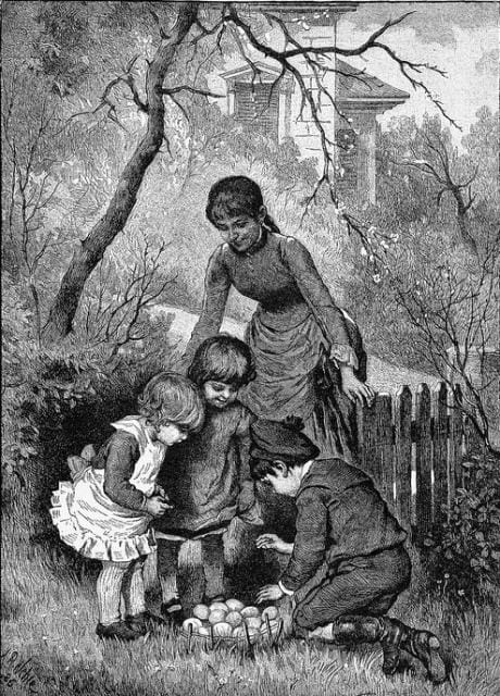 Вляво: Момче държи голямата награда от състезанието по търкаляне на великденски яйца, което се организира от Белия дом от 1878 г. насам. Търкалянето на яйца е стара британска и северноирландска традиция, която символизира отместването на камъка от Христовата гробница. Снимката е от 1923 г. Източник: Wikimedia Commons. Вдясно: Гравюра от 1889 г., публикувана от американския издател и печатар Даниел Лотроп. Авторът е неизвестен. Източник: Wikimedia Commons