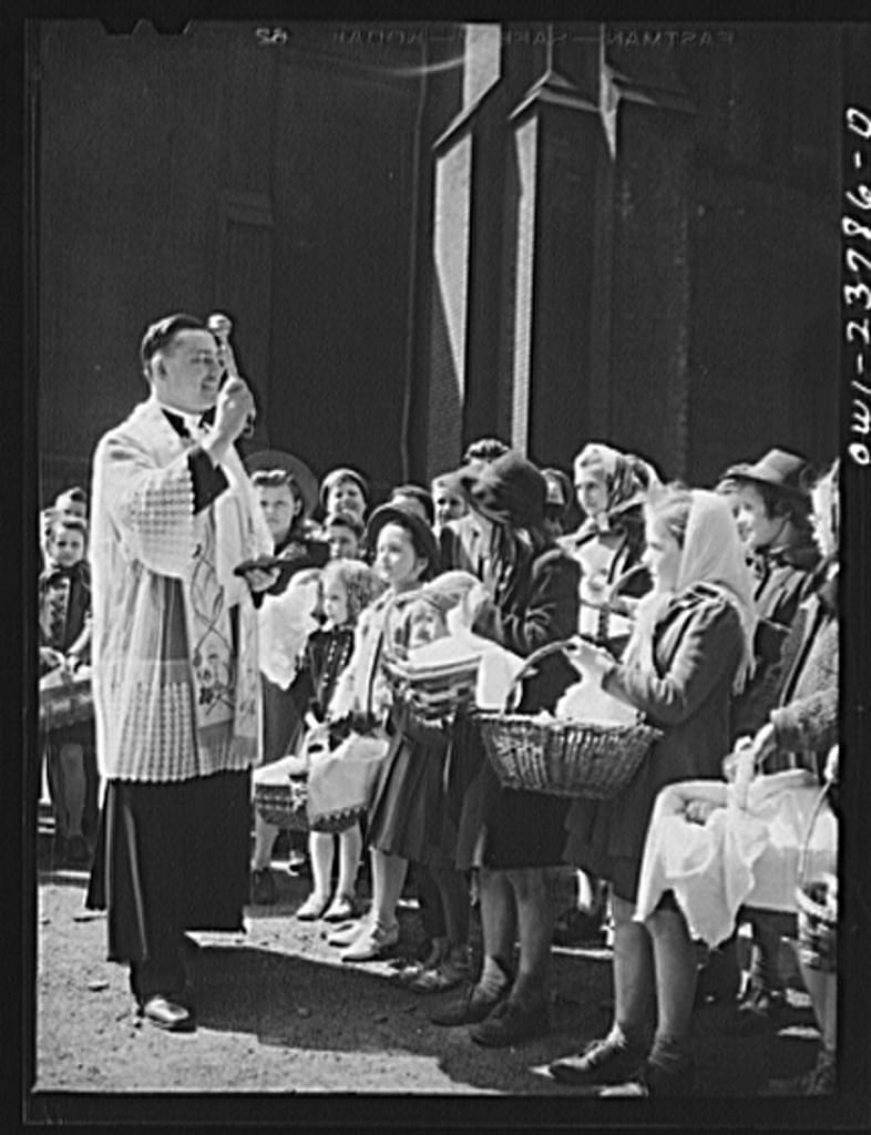 Вляво: Типична полска церемония по благославянето на кошниците, Полша, 2007 г. Източник: Wikimedia Commons. Вдясно: Благославяне на кошниците пред църквата в Бъфало, Ню Йорк. Полската общност в деня преди Великден, април 1943 г. Източник: Wikimedia Commons