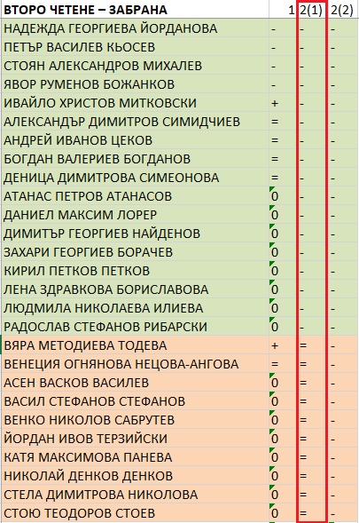Същевременно двама подкрепят предложението на „Възраждане“ – Вяра Тодева и Ивайло Митковски, а петима се въздържат – Александър Симидчиев, Андрей Цеков, Богдан Богданов, Венеция Нецова-Ангелова и Деница Симеонова.