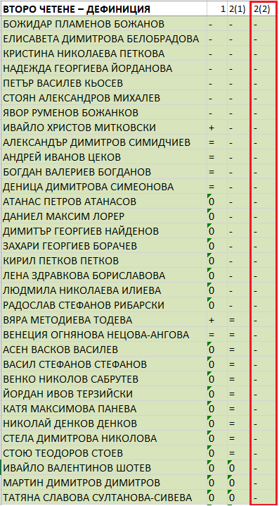При гласуването на дефиницията към противопоставилия се Тервел Георгиев се присъединява и Георги Георгиев, а останалите трима, които на първо четене се въздържат, запазват позицията си. 56 депутати гласуват за. Що се отнася до дефиницията на ориентацията, против са вече 6 народни представители от най-голямата група, 8 се въздържат, а 47 гласуват за.