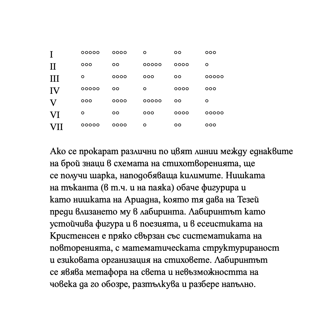 И действително математиката и музиката са в сърцевината на поезията на Кристенсен, но не нарушават балансите на поезията: тя надделява над изчислението, било и то част от вселената. (Прочее, идеология, математически сходна на тази на Ингер Кристенсен, съм срещал само у друг велик поет – Иван Методиев, в книгата му от 2006 г. „За образите и световете“. И у двамата природата ликува.)