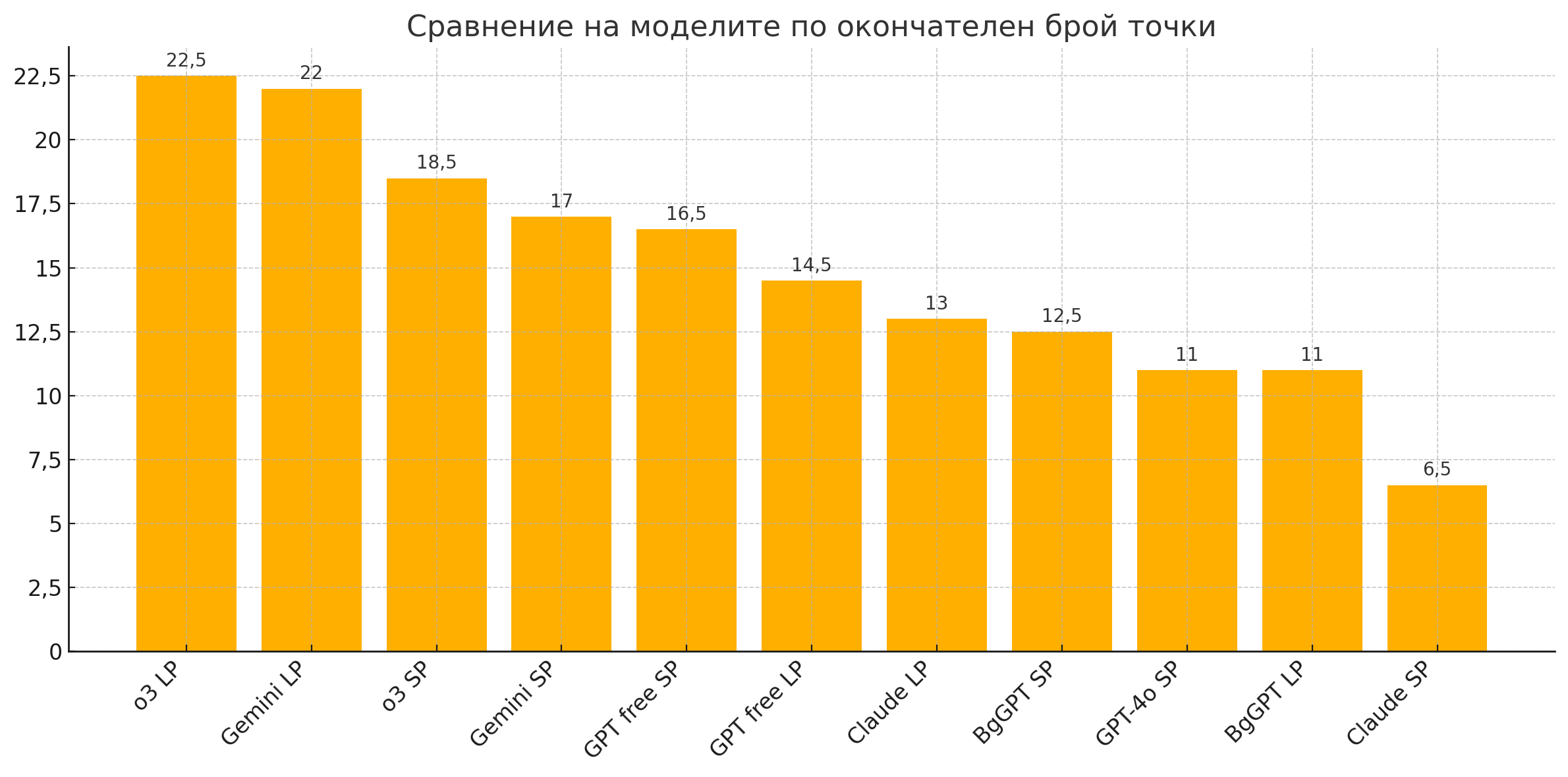 22,5 от максималните 30 точки получи победителят o3 (LP), а само на половин точка след него е Gemini (LP). Най-слабо представилите се модели като цяло са успели да покрият минимум 1/3 от грешките. Доста сериозна е разликата в представянето и заради различните задания – когато получат по-дълъг и прецизен промпт, моделите се представят значително по-успешно. С две изключения – GPT free и BgGPT – вероятно защото като по-малки модели по-трудно могат да навлизат в дълбок контекст.