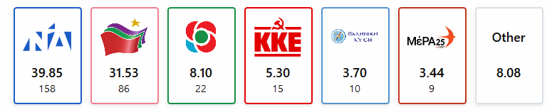 За 300-те места в еднокамарния гръцки парламент (50 от които се дават автоматично на партията победител, останалите се разпределят пропорционално) се състезаваха 20 партии. Само шест от тях преминаха 3-процентния изборен праг, в т.ч. крайнолявата Гръцка комунистическа партия (5,3%, или 15 депутати, колкото имаше и досега), лявоцентристкото Движение за промяна, което увеличава броя на депутатите си от 17 на 22, и крайнодясната проруска партия „Гръцко решение“ (3,7%, или 10 депутати).