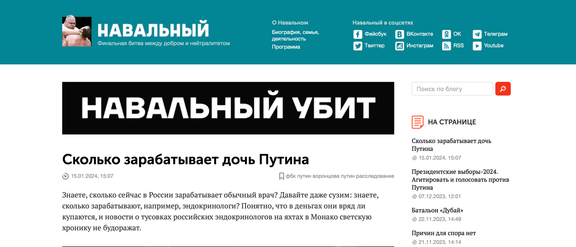 През 2015 г. популярност набират и разследвания като филма за тогавашния главен прокурор Юрий Чайка, който към днешна дата има над 26 млн. гледания. Сензацията продължава с „Он вам не Димон“, документално разследване за богатството на Дмитрий Медведев, заемащ най-различни длъжности под опеката на Путин.