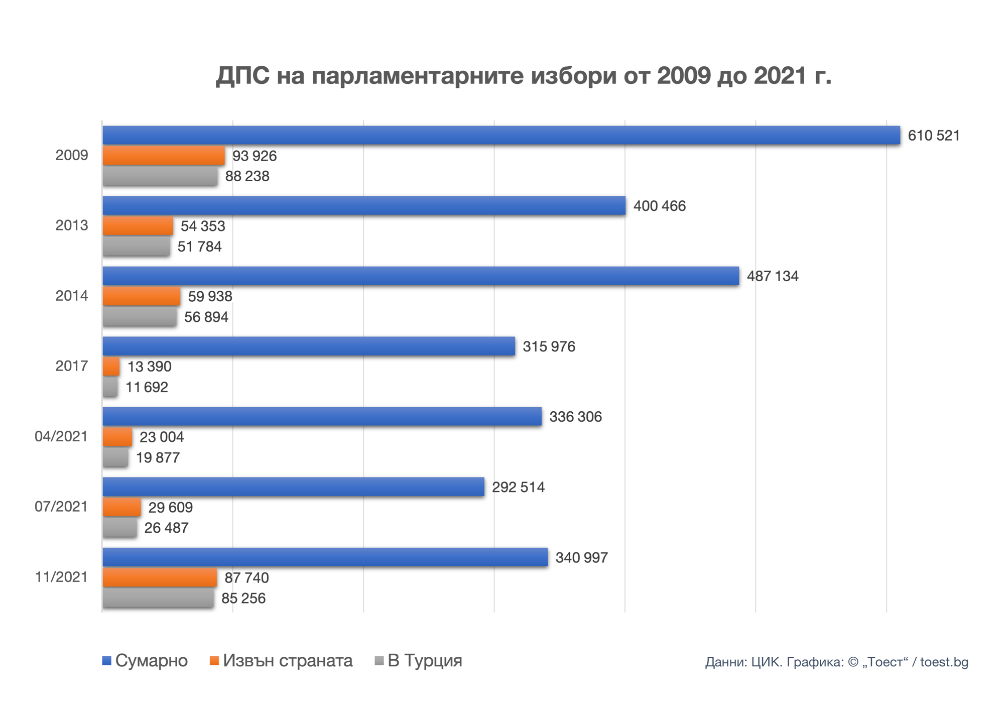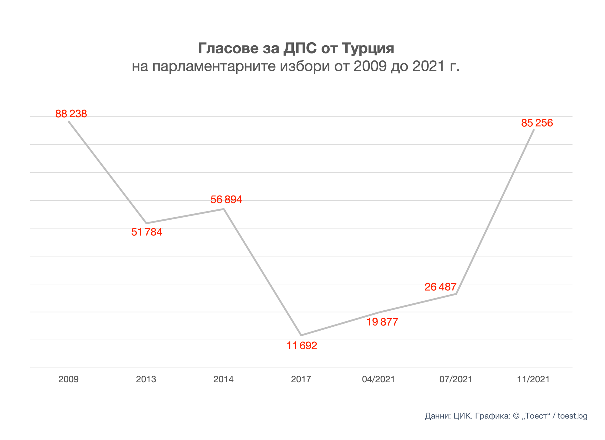 - На парламентарните избори на 14 ноември в секциите в Турция са подадени близо 59 000 гласа повече спрямо предишните избори. От тях 99,45% са за Движението за права и свободи.