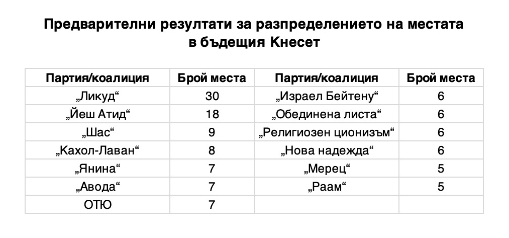Повечето сочат, че партията на Нетаняху може да разчита на 27 или 30 места, но въпреки тази преднина премиерът няма да може да състави самостоятелен кабинет. Необходими са му 61 места, за да застане начело на коалиция на мнозинството.