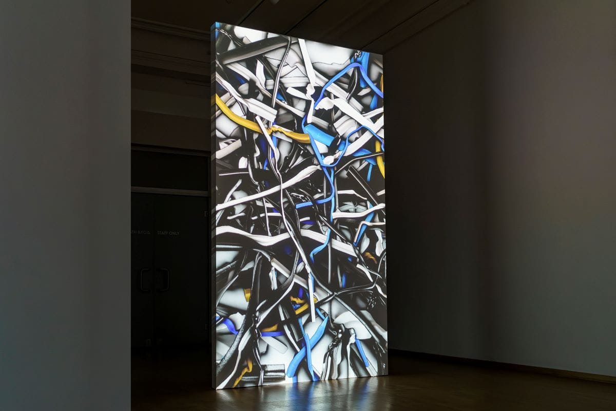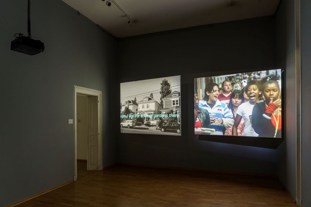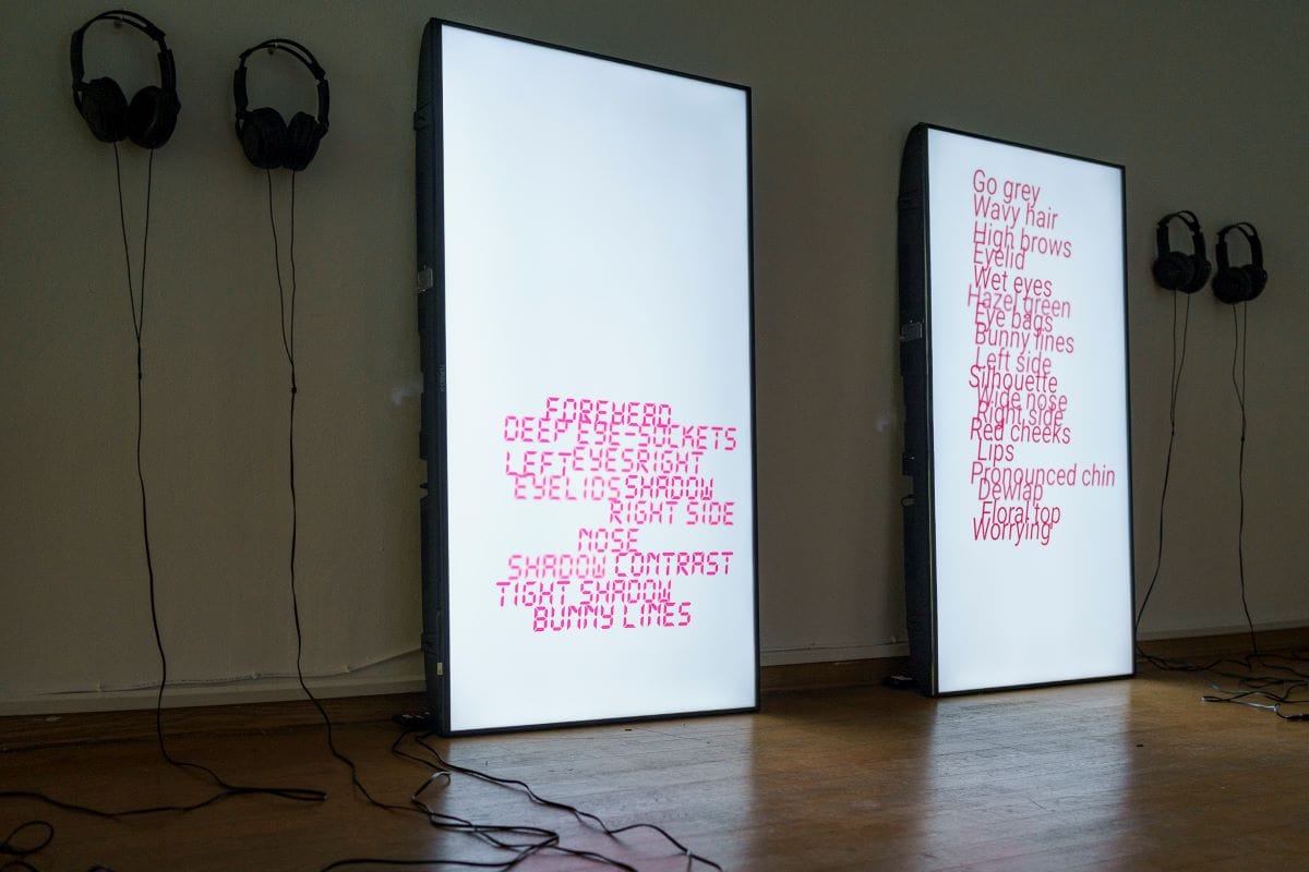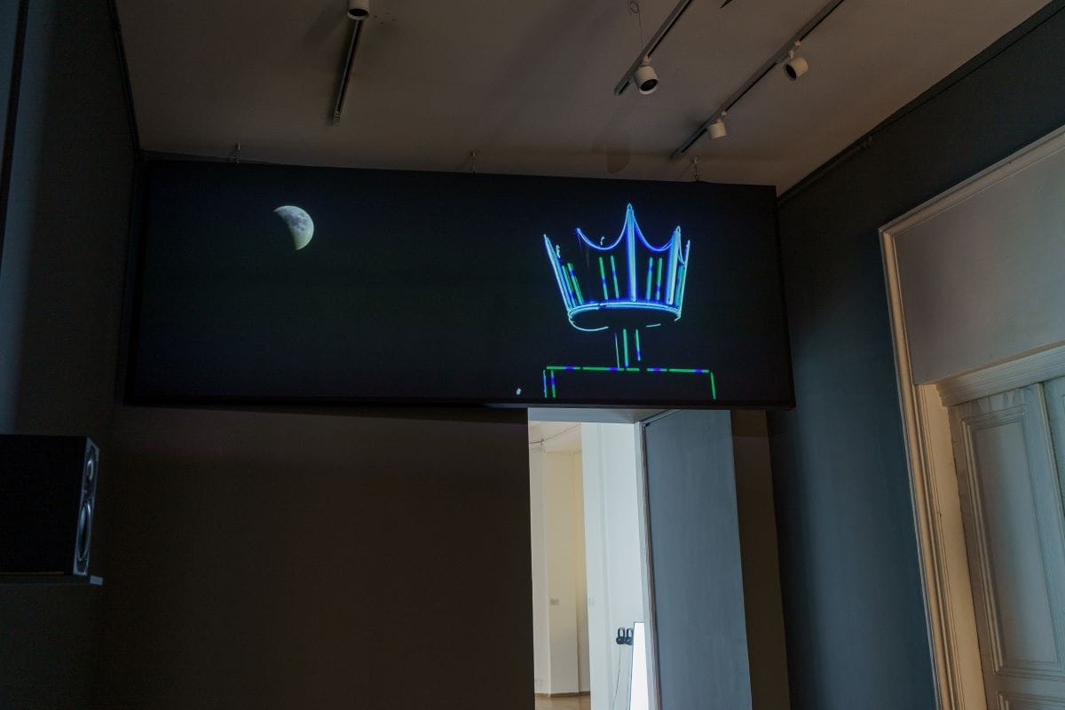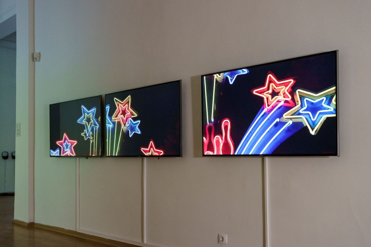 Това е първата самостоятелна изцяло видеоизложба в пространствата на „Двореца“: дори изумителната фотография – емблема на изложбата – в осветения притвор с пазача е кадър от видеото „Displace (без перука, без червило, без телефон и без цигари)“ от 2016 г. и отвежда към техноеротиката на „Руса жена с червена рокля и ярко червило говори по телефона и пуши цигара“ по диагонал в затъмнения централен коридор. Отреденото за видеоизложбата пространство на Двореца е промислено, усвоено и „огънато“ така, че да накара работите да си говорят и допълват, докато то самото съучаства в интегралния ефект. Или „в интегралното преживяване“, тъй като наблюдаващият все повече се самоосъзнава като съучастник.