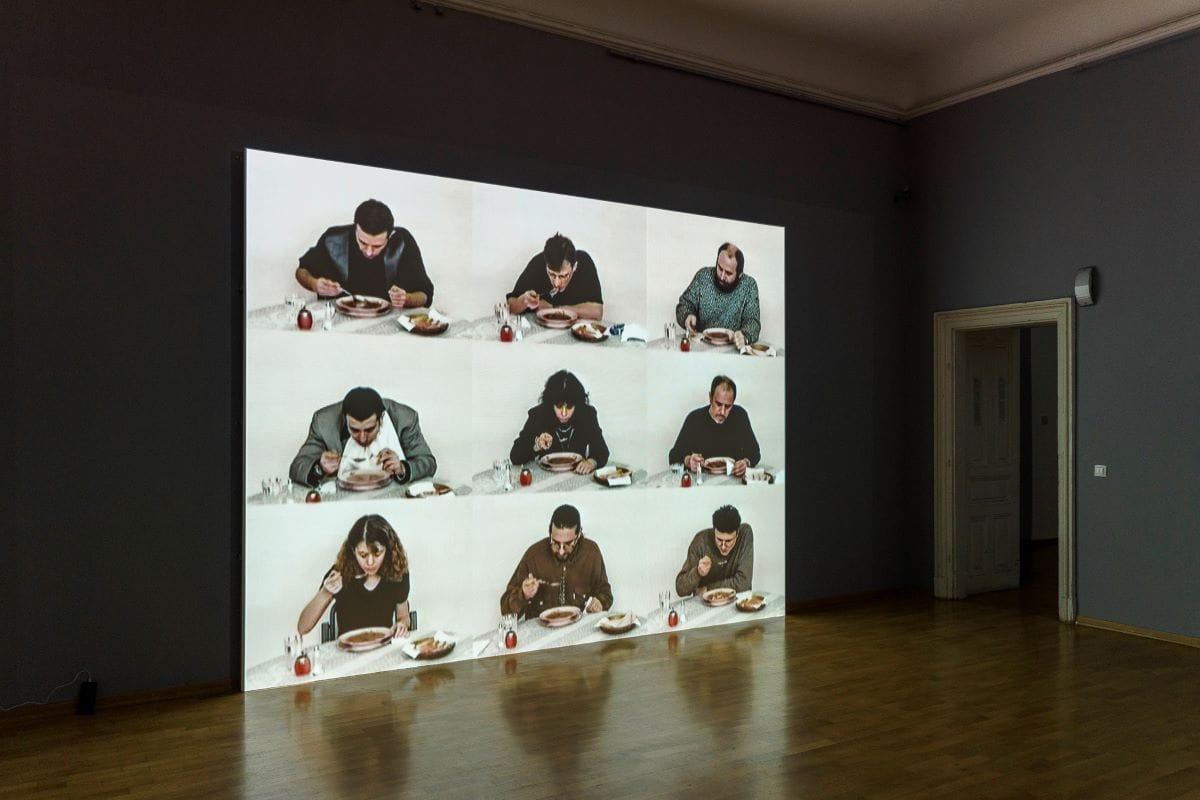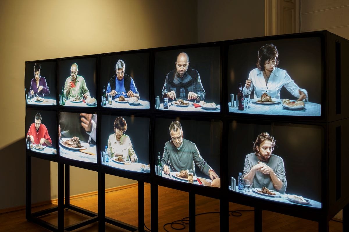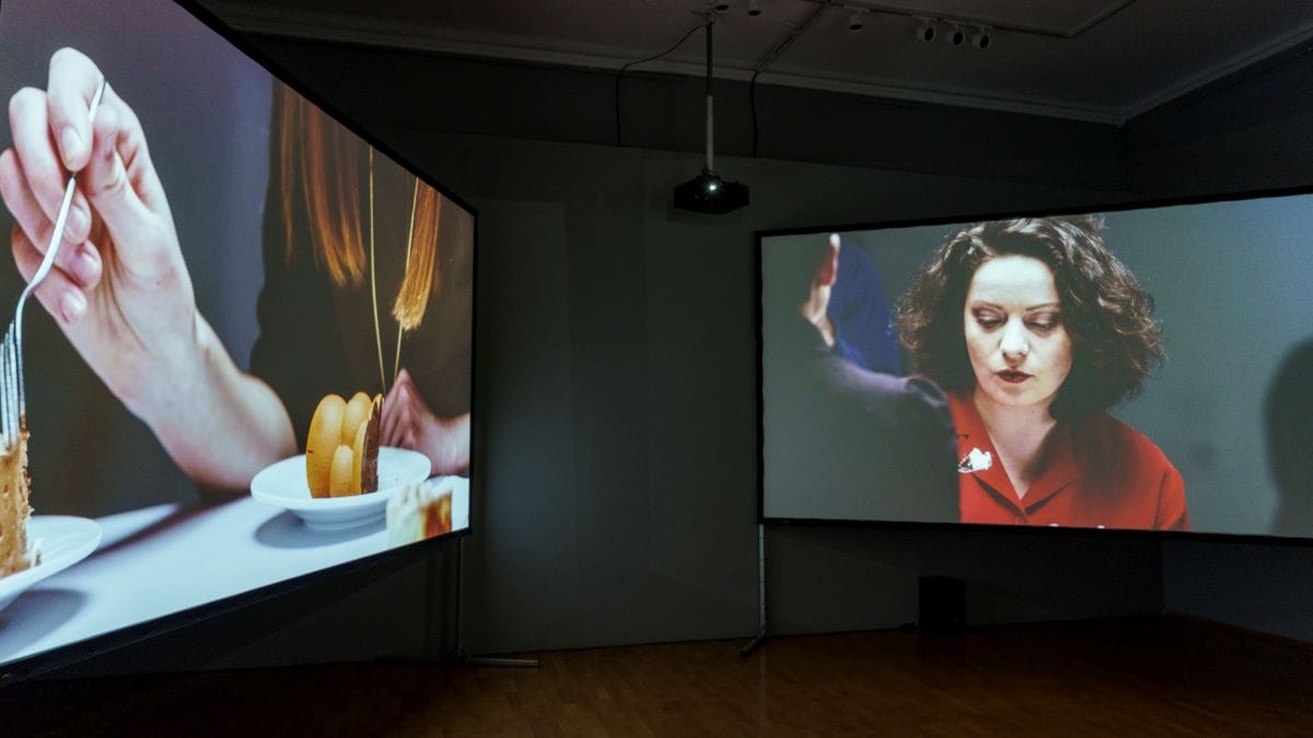 Творбите „подреждат“ няколко четливи каузално-континуални или метафорично-асоциативни разказа. Това е най-очевидно при немия триптих с храненето в три от четирите зали вляво от централния коридор, отвеждащ до Used/Loosen. Левият завой ще отведе зрителя до триптиха с груповото хранене на арт общността в „правилната“ последователност: от супата през 1998-ма, през основното (кокала) през 2006-та, до десерта (с черешката) през 2020-та. По-вероятно е обаче още с влизането си зрителят да падне в мрежата на триканалната видеоинсталация „Десертът“– този могъщ и протяжен, сложно заснет и режисиран, технически съвършен и смразяващо безнадежден opus magnum.