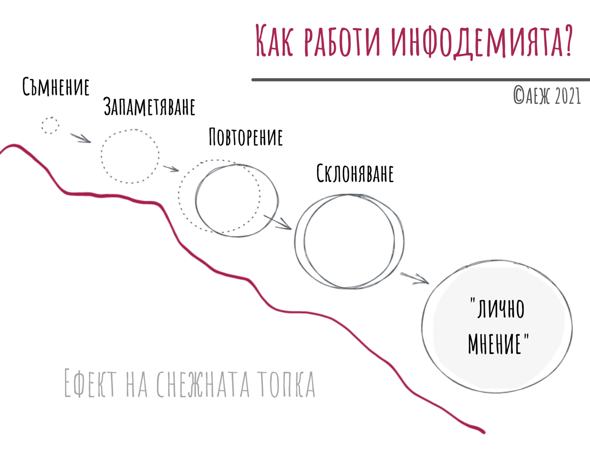 Накратко: източниците на дезинформация са малко на брой, но особено активни онлайн профили (които често повтарят няколко основни тези). Социалните мрежи улесняват инфодемията, защото споделянето скрива първоначалния източник на информация. Трудно е да отсеем истината, особено по специализирани теми. Дори да сме скептични към подозрителни профили, ние се доверяваме на близки, без да знаем дали те са проверили това, което споделят. В паметта ни се запечатва прочетеното и неволно приемаме непроверени твърдения за факт. Малко са тези, които нарочно споделят невярна информация – инфодемията е опасна, защото е несъзнателен процес.