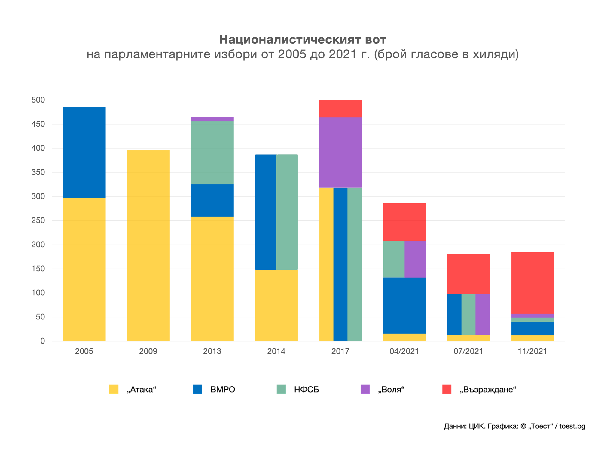 Освен това от 2005 г., когато „Атака“ влезе в парламента, в него винаги е имало националисти (с изключение на двете твърде кратки 45-то и 46-то НС). А от 2014 г. нататък различни националистически партии имаха неизменна роля в управлението – било като „златния пръст“ на Волен Сидеров, на който се държеше кабинетът на Пламен Орешарски, било като част от властта.
