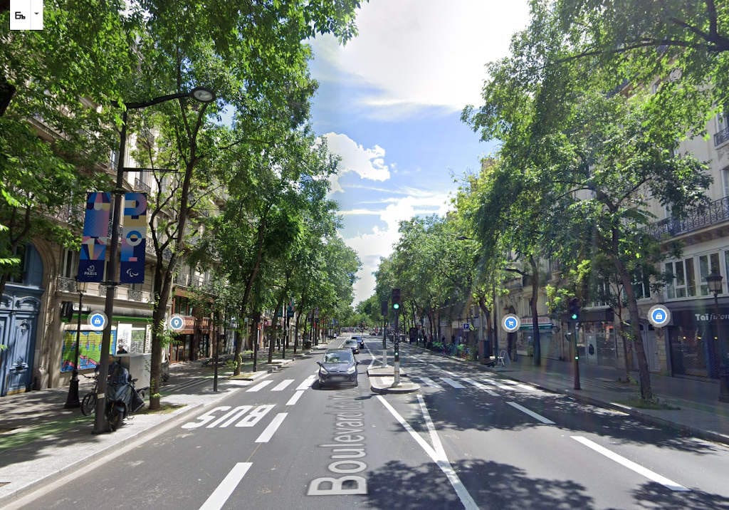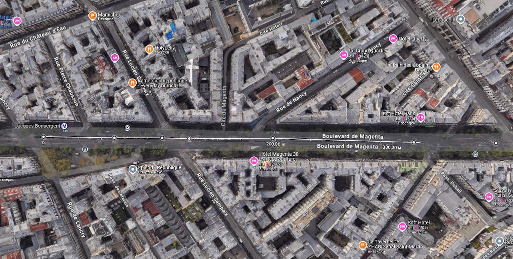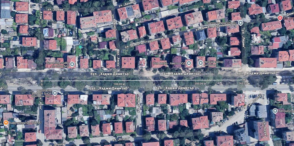 Сравнение между бул. „Хаджи Димитър“ (вляво) – 260 метра между възможностите за пресичане, платна, отделени с огради, и бул. „Мажента“ в Париж (вдясно) – пресичания на съответно 60, 40, 20, 70 и 120 метра и никакви огради. Източник: Google Earth
