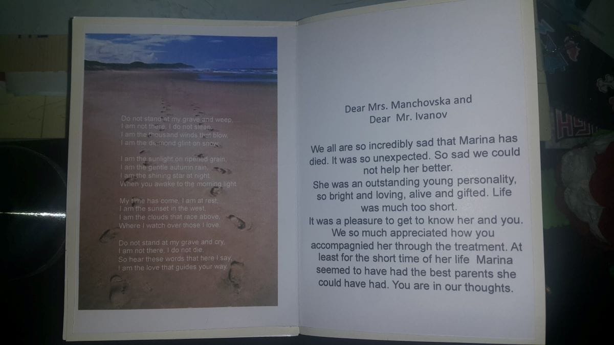 Николай: Около месец след като вече всичко беше приключило, една вечер намерихме картичка в пощенската кутия. Разпознахме хора от 4 различни отделения в детската клиника във Франкфурт – детската онкология, центъра за трансплантации, дневния стационар и интензивното. Сред тях и подписите на светила в детската онкохематология в световен мащаб – професор Бадер, Ева Ретингер, Андреа Яриш, Ян Зьоренсен. И после нека някой пак ми каже, че нямало разлика в отношението…