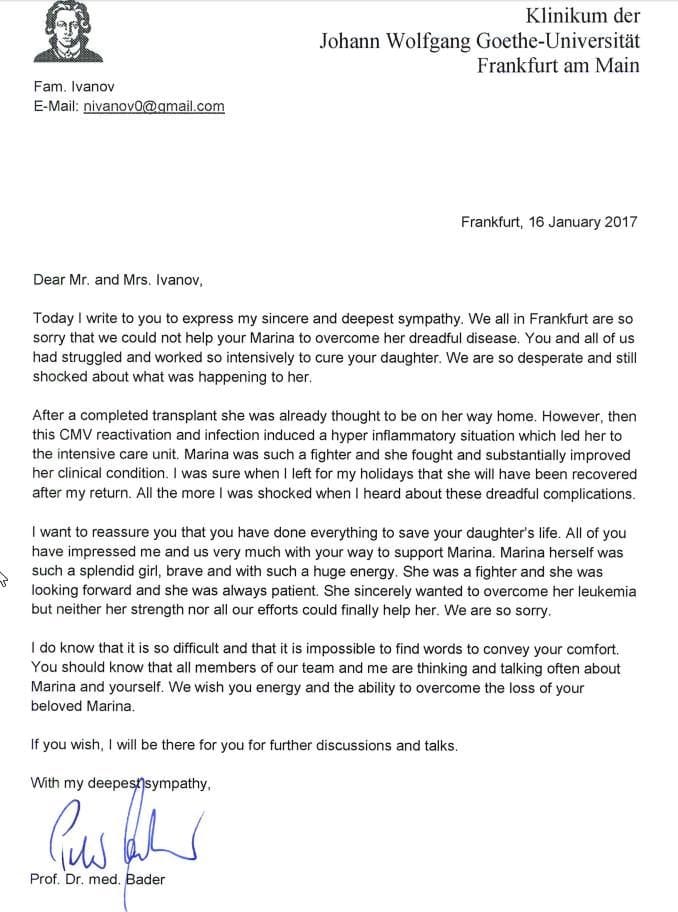 Думи на съчувствие и подкрепа от екипа на болницата и писмо от проф. Бадер © Личен архив