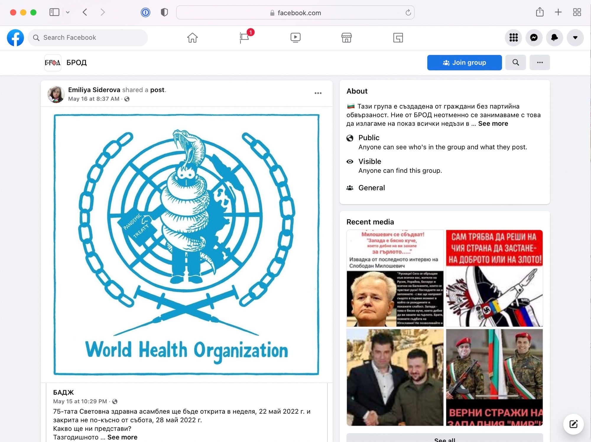 Друг пример за важността на източниците е Facebook групата БРОД, в която членуват над 18 000 души и чиято хронология проследява ясно маркирана дезинформационна траектория – от Стратегията за детето, през антиковид съдържание, до изключително проруски и антиукраински информационни материали в настоящето. В този случай не е ясно кое е първо – яйцето или кокошката, тъй като е напълно възможно потребителите на БРОД да се информират от едни и същи източници, които преливат от една дезинформационна линия в друга. Тогава би ставало дума за дезинформация или малинформация, преминала в мисинформация.