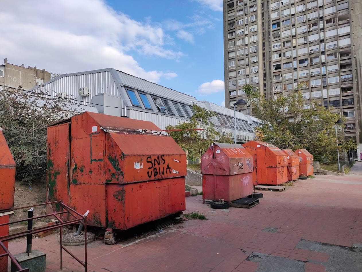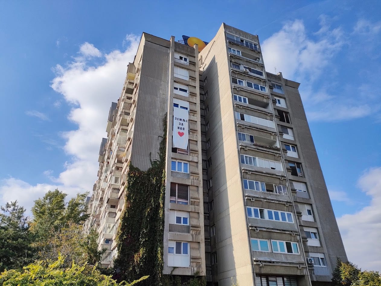 След десет дни пътуване се прибираме в столицата – обиколката свършва. Излизаме от магистралата в Нови Белград и след един завой сред югославския жилищен брутализъм от една огромна кооперация ни дебне друг транспарант, където този път пише на кирилица: Земљя за нас. Без въпросителна, без възклицателна, а с едно голямо червено сърце.