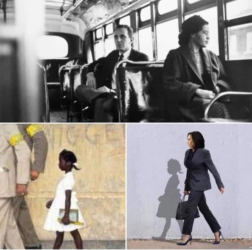 Може би сте виждали този колаж. На горната снимка е Роза Паркс, която през 1955 г. дръзва да седне на място за бели в автобуса и да не се съобрази с нареждането на шофьора да отиде на местата за чернокожи. Долу вляво е 6-годишната Руби Бриджес, която през 1960 г. става първото афроамериканско дете, тръгнало на училище за бели. И накрая е Камала Харис, която крачи, а сянката ѝ е силуетът на малката Руби. Ако Харис победи в президентската надпревара, ще е успяла да строши бариерата на най-високия стъклен таван в САЩ – и за жените, и за цветнокожите.