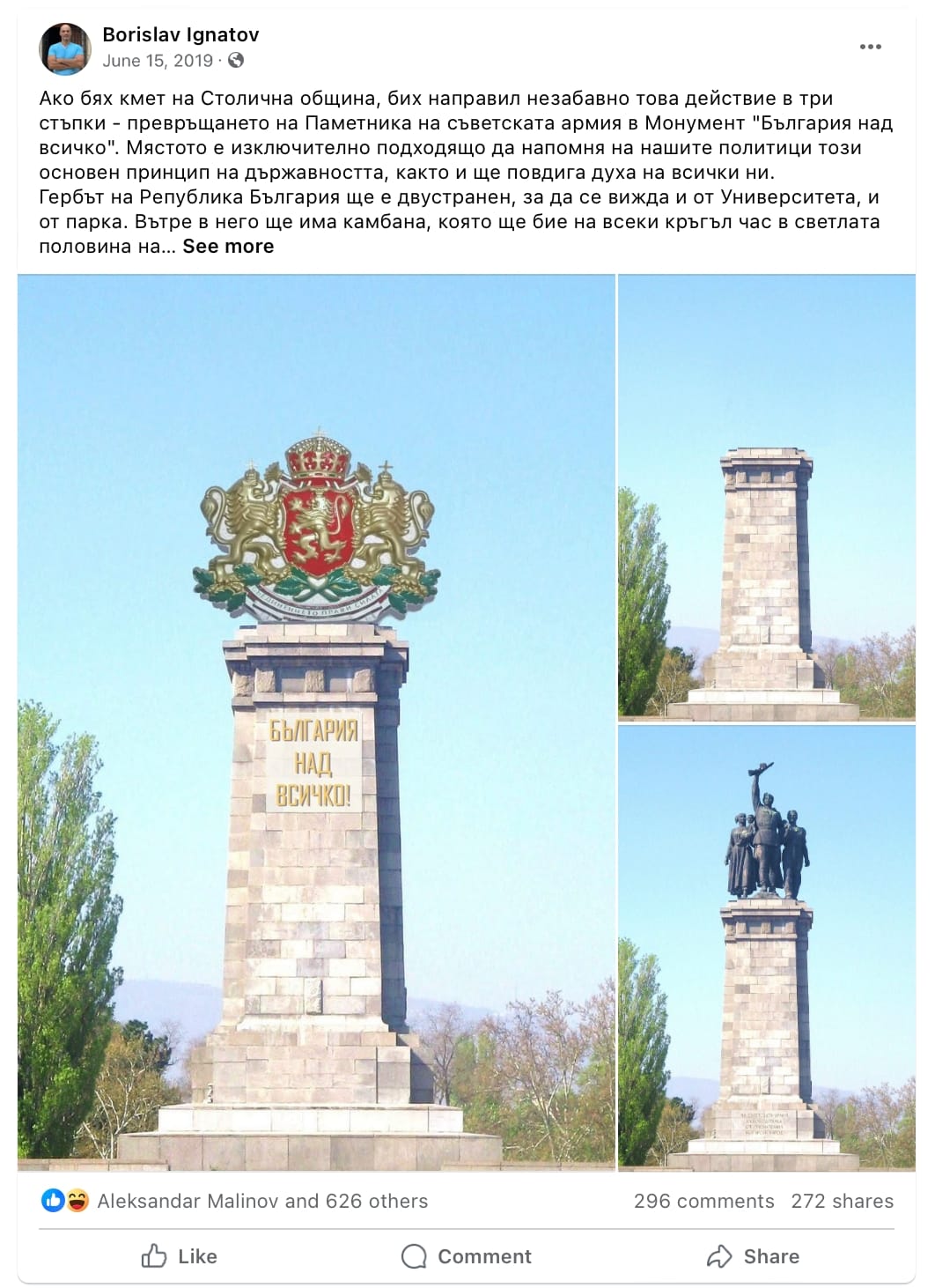 През юни 2019 г., няколко месеца преди местните избори, неочаквано появил се архитектурен проект фокусира за пореден път вниманието върху прословутата тема „Какво да правим с Паметника на Съветската армия в София?“. Тогавашният председател на Камарата на архитектите в България Борислав Игнатов публикува в личния си профил си във Facebook три визуализации на нов монумент „България над всичко“ – триизмерен герб на мястото на фигурите върху пиедестала на Паметника на Съветската армия, снабден със скрита камбана, която да звъни на всеки кръгъл час като във възрожденска часовникова кула.
