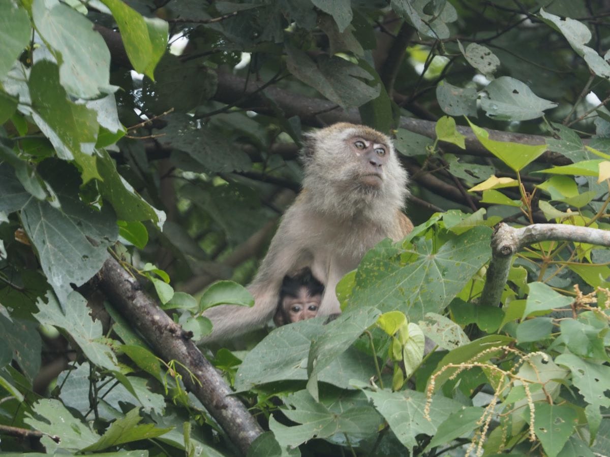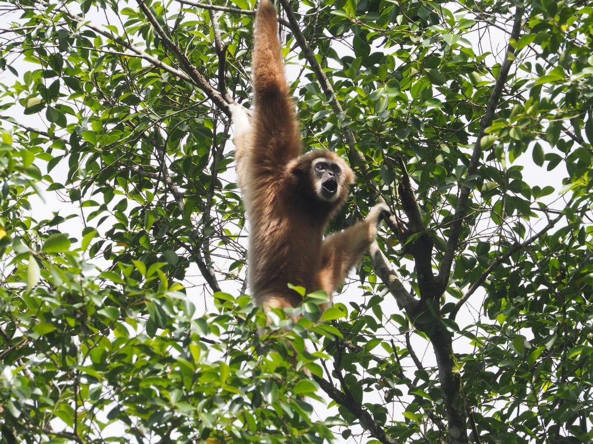 За един месец, в който обикаляхме страната, се научих отдалеч да познавам къде са – първо чувате звука от мощно пукане на клони и раздрусване на листа, после виждате как някое дърво силно се привежда, а накрая, ето го и него – едър сив макак, който се държи като парашутист за края на клонака и прелита от едно дърво на друго. Белоръкият гибон е още по-живописна гледка – той просто виси като прани гащи и издава особено силен звук, подобен на протяжен лай – така общува с жена си (двойките са моногамни) и скрепява връзката си. Заради този леко комичен лай наричат белоръкия гибон „шоумена на джунглата“.