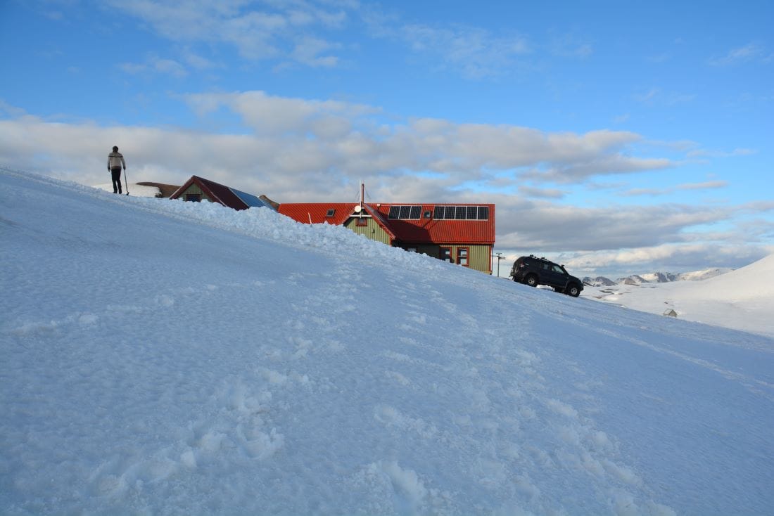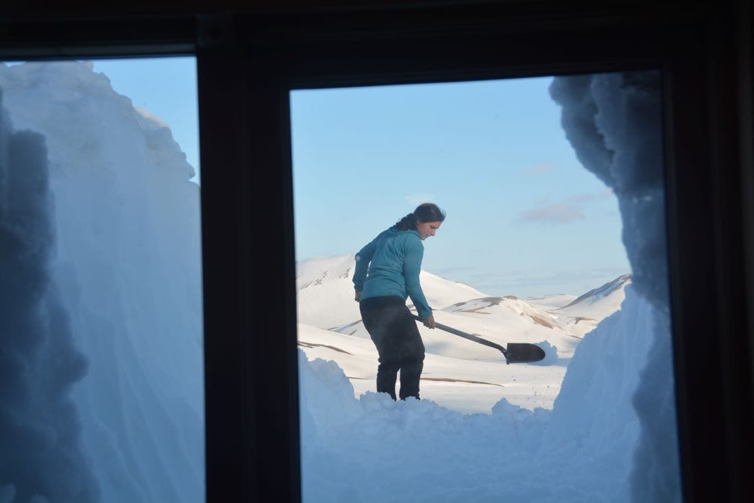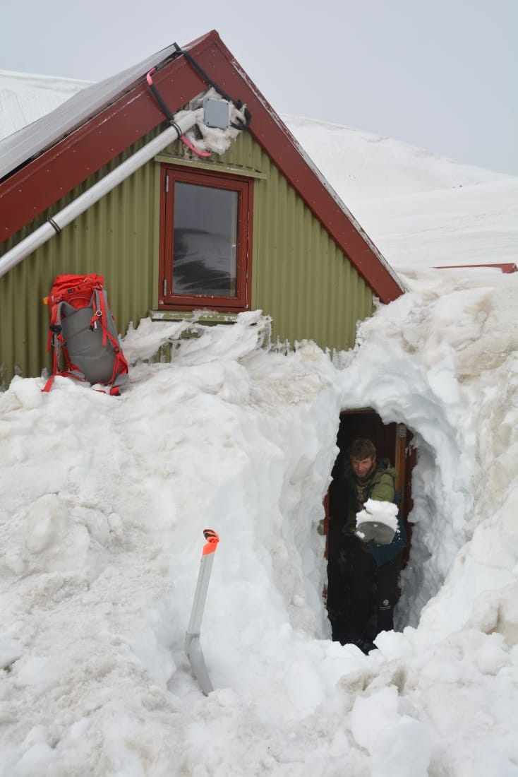 През летните месеци постоянно имаше или топящ се сняг, или нов снеговалеж. При откриването на сезона през юни всичко бе потънало в три метра сняг, затова трябваше да изкопаем снежен тунел, за да стигнем до вратата. С лопати оформихме импровизирано стълбище в снега, което с всеки следващ ден се снишаваше от топенето. Отварянето на вратата също си беше усилие, тъй като снегът бе натежал от едната страна на къщата и бе изместил всички прави линии.