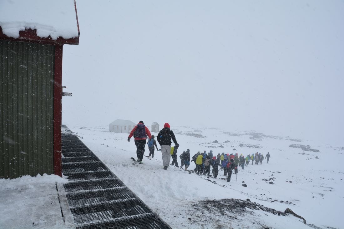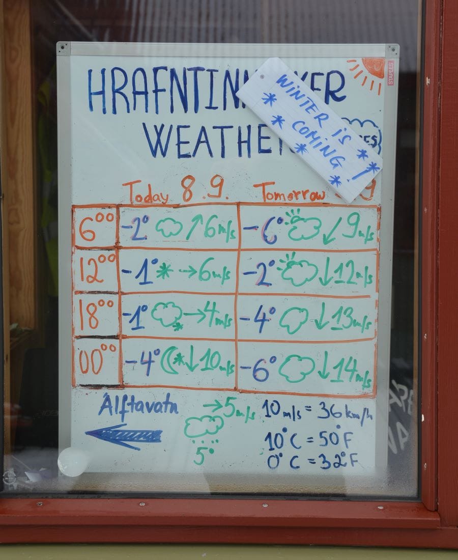 Дойде август. Дни наред ветровете са със скорост 70 км/ч, вали обилно, снегът преминава в дъжд и обратното. Повечето туристи не са подготвени за зимни условия и молят за място в хижата, искали да палаткуват, но такъв вариант в това време няма. „Не погледнахте ли прогнозата, преди да тръгнете? Не чухте ли, че идват страшни ветрове? – питам ги, а те смутено клатят глави. – Излагате се на опасност, ветровете в Исландия могат да ви повалят, а спре ли човек да си почине, измръзването идва неочаквано бързо.“ Тази вечер хижата е със свръхколичество матраци, оползотворен е всеки метър, приютяваме и последния стигнал дотук. Надяваме се останалите да са направили обратен завой навреме...