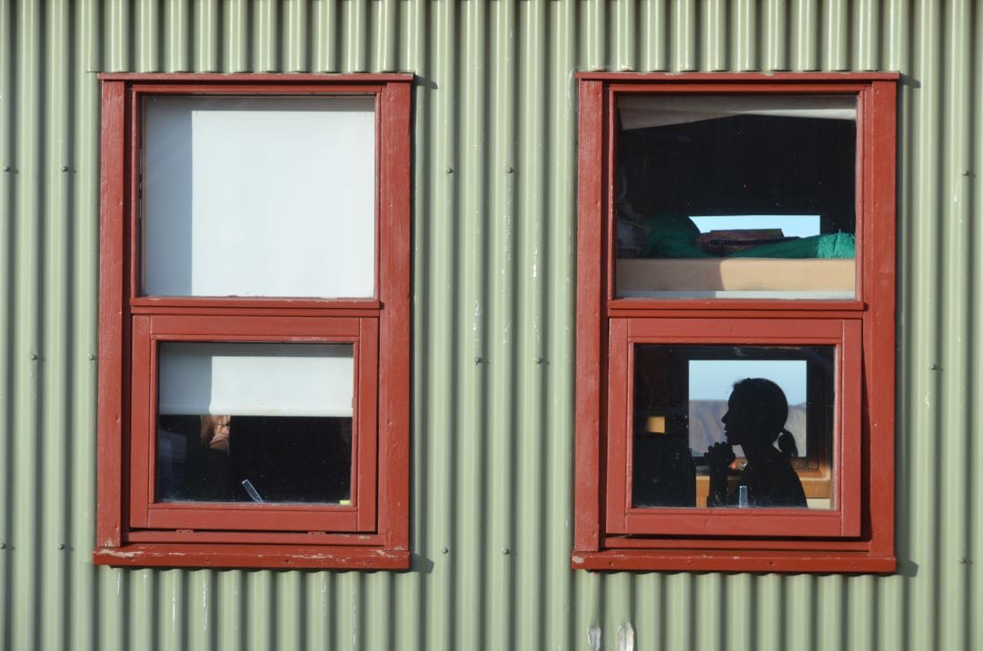 Мобилен обхват имаше само по височините, но за работа разполагахме с безжичен интернет от сателит. Когато връзката изчезнеше, се катерехме по близкия хълм с лаптоп в ръка в слънце и мъгла, за да проверим прогнозата за времето и да можем да информираме туристите. За къмпингуващите имаше заслон, както и импровизирани заоблени стени от обсидиан, които предпазваха палатките от силните ветрове. С другите пет хижи общувахме чрез радиостанция.