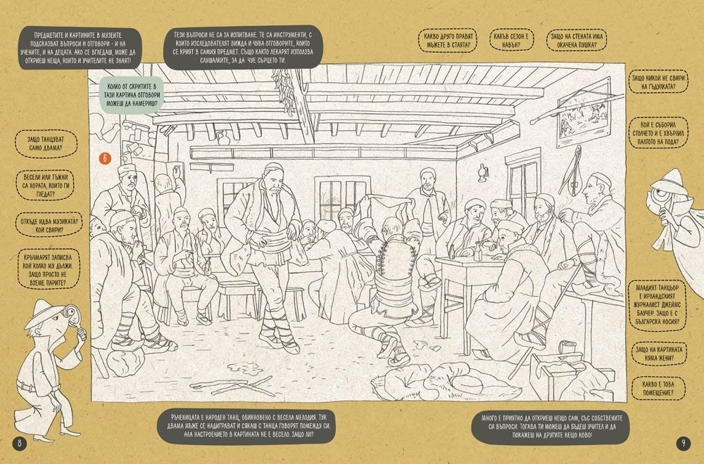 Красивите рисунки на Сияна Захариева също са превърнати в площадка за игра, например подканят детето да ги оцвети. Всичко в книгата е живо – от гаджета дървета до скелети, които се оплакват от домашното си. Хуморът е важна част, която също олекотява очакванията и изживяванията в музея. Съвсем позволено е, оказва се, да се смеем в тези сериозни и тихи зали.