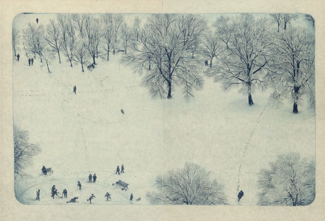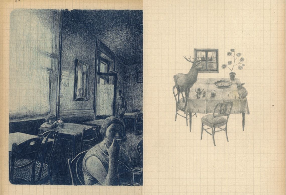 Полската художничка Йоана Консехо е майстор в създаването на атмосфера – дори с начина, по който едва щрихира хората, но с внимание рисува оставените от тях следи в снега. Моливите помагат за усещането за меланхолия. Има емоционална подготовка за това, което следва. И хубави детайли – като дребна пощенска марка или пък нарисувана между вътрешните корици семейна снимка точно където и самият ти би си втъкнал някой спомен. И дърветата в зимния парк ти изглеждат като истински, сякаш присъстват.