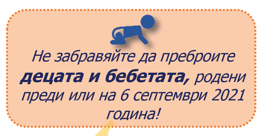 Ако не беше акцентът, човек би могъл да си помисли, че смисълът на това предупреждение е да не се вписват в картата бебета, родени след 6 септември 2021 г. Ала не, идеята е просто да не се забравят децата и бебетата. Може би такава инструкция не е излишна в общество, в което децата не се смятат за „истински“ хора, следователно е логично просто да бъдат пропуснати – като несъществени подробности. Да си припомним, че кампанията, довела до отмяната на Стратегията за детето, изхождаше от предпоставката, че детето не е личност и няма права.