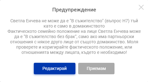 Когато стигаме до описанието на конкретните лица в раздела „Население“ обаче, става ясно, че хората са или мъже, или жени. Не се допуска дори възможността да се затрудняват да отговорят. Ако се преброявате електронно и вече сте посочили ЕГН-то си, не може да се впишете с пол, различен от този по документи – системата отправя предупреждение, че полът не отговаря на ЕГН-то ви.