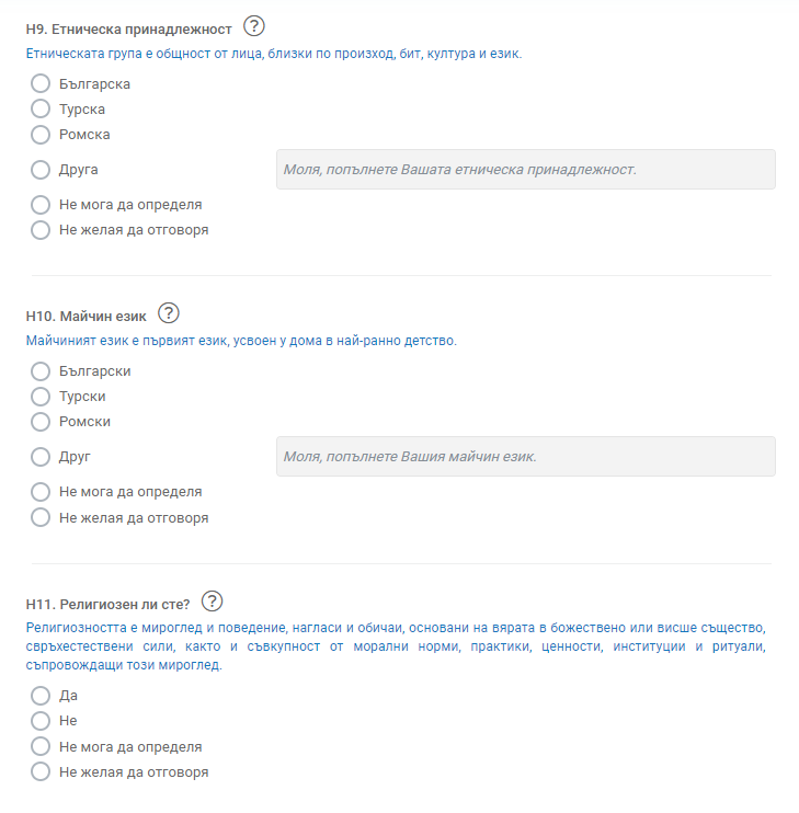 Във вариантите за отговор на въпросите за етноса и майчиния език, както и в тези за религията, се забелязва една на пръв поглед козметична, но всъщност много съществена промяна – опцията „не се самоопределям“ е заменена с „не мога да определя“.