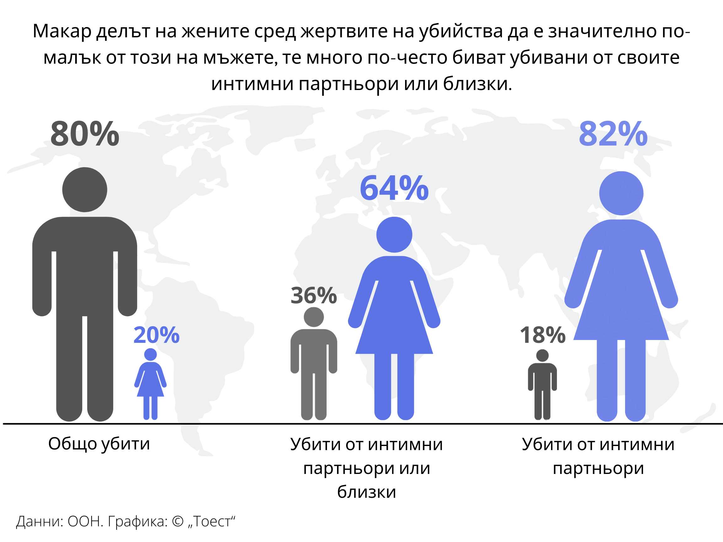 По данни на медийни публикации от началото на 2021 г., 15 жени са били убити от близък до тях мъж. Разчитаме на публикации, защото официална статистика за тези жертви в България липсва. Между 2017 г. и 2021 г. има 141 постановени присъди за убийства и опити за убийства на жени. Сериозен обществен диалог за причините, които водят до насилие в семейството, обаче все още няма.