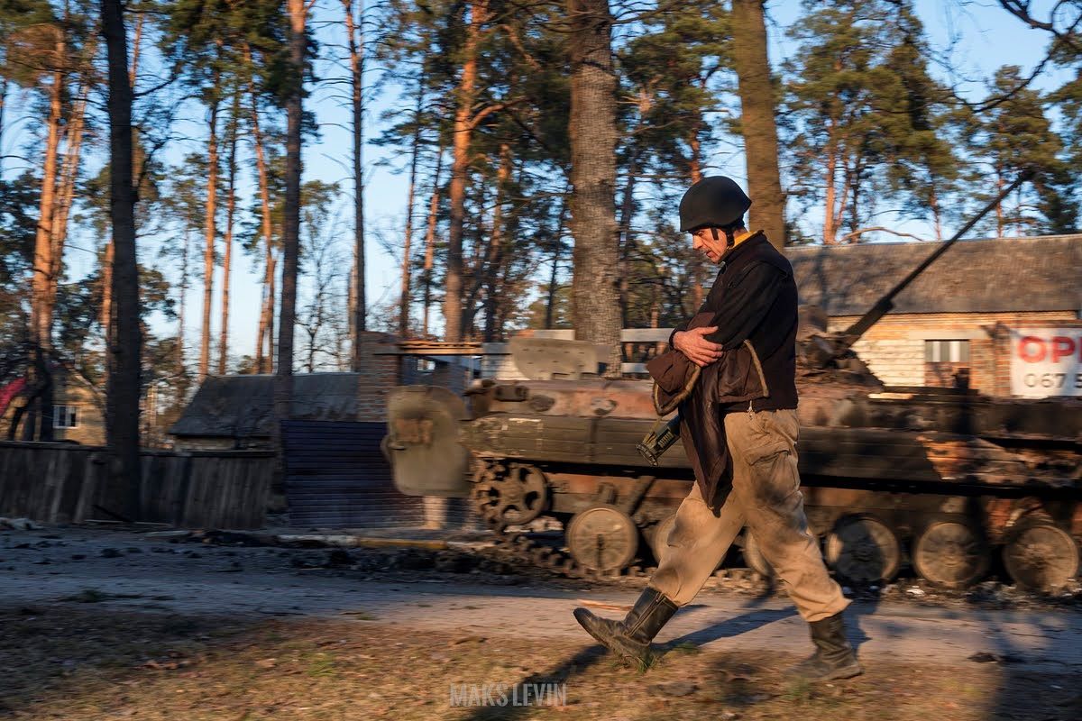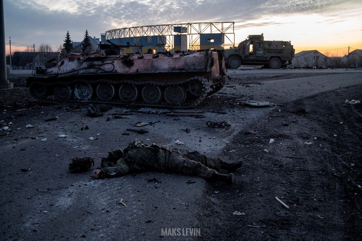 Много от военните машини са обгорели, някои са без покриви, на трети има надписи: „Азов“, „Зарубежна“ (Чуждестранен), „ За Харкiв“ – с нарисувано до надписа сърце, „Никополь не бьi забуди“ (Никога не забравяйте Никопол), „Слава Україні“, „Дніпро“, „Руский иди на хуй“. Някои надписи са върху бетонни плочи, закрепени на танка. Вероятно са част от сграда или от нещо друго, взето от мястото, където танкът е рушил и убивал. Буквите са изкривени, набързо надраскани, задъхани и разтреперени.