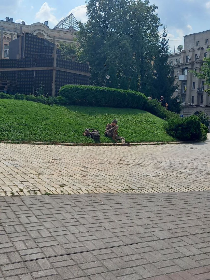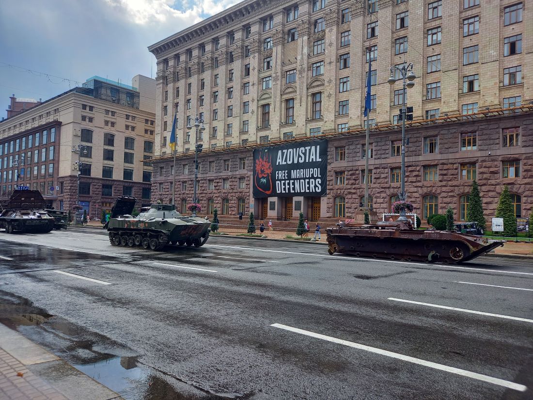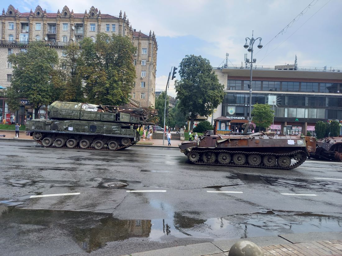 Дулото на танка сочи точно срещу изхода на метрото. Залива го пелена от проливен дъжд. Майданът и булевардът до него са притихнали под тежестта на сиви облаци и военна техника. Подготовката за парада на пленени руски бойни машини от сегашната война на Русия срещу Украйна започва ден преди 24 август, Деня на независимостта на Украйна. Дъждът в Киев полека-лека спира и мога да разгледам всичко по-отблизо.