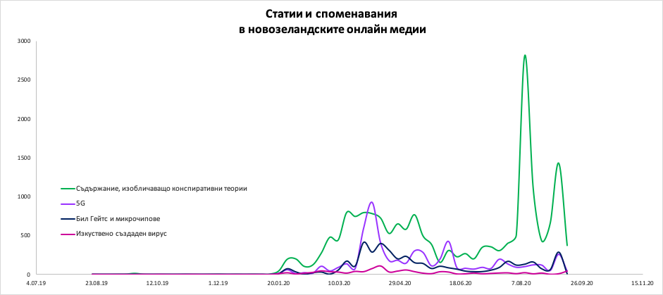 Преглед на медийното съдържание през последните месеци показва, че както и на много други места по света, водещата конспиративна теория в местните социални медии е предполагаемата връзка между 5G и разпространението на вируса. Окуражаващо е, че новите споменавания в тази насока и по други митове по темата не нарастват (поне в публичния разговор; трудно е да се дадат точни данни какво се случва в лични профили и затворени групи), а същевременно все повече публикации обсъждат конспиративните теории и ги изобличават в местните медии.